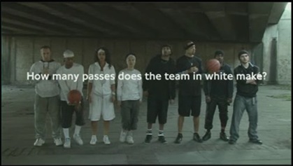 O vídeo abaixo foi feito pelo Departamento de Transportes de Londres e tem como objetivo testar a atenção de quem o assiste. Você precisa apenas contar quantos passes o time branco troca. No fim, vem a resposta e... não vou entrar em mais detalhes. Quem tem a conexão lenta provavelmente vai ver o vídeo travando, mas acho que não tem muito problema. Clique na imagem abaixo e preste atenção!